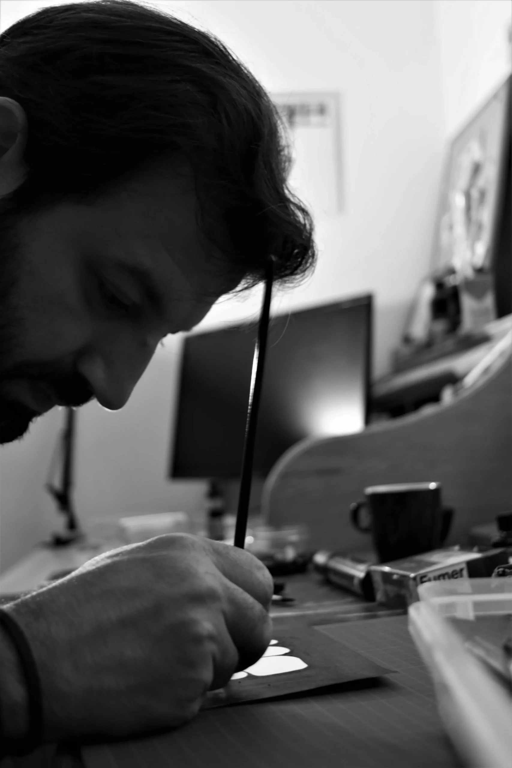 Over time, this methodology extended beyond individual artistic production. What began as a personal visual inquiry gradually evolved into a collaborative platform: Studio Eclart, a design studio founded on the same principles of narrative clarity, formal precision, and contextual responsibility. The studio allows this method to operate in dialogue with institutions, cultural initiatives, and commercial partners. Rather than separating art from applied design, both are approached through careful listening, structural thinking, and long-term coherence. Born in 1986 in Masyaf, Syria, Tammam began working in graphic design in the early 2000s while pursuing academic studies in law at the University of Damascus. During this period, questions of rights, representation, and public expression began to intersect with his visual practice. What initially emerged through graphic production gradually expanded into a broader artistic inquiry , exploring the human figure, spatial compression, and the tension between structure and fragility. His work has since moved toward greater reduction and formal clarity, distilling experience into precise visual systems across disciplines. Today, his practice operates between independent artistic production and collaborative studio work. His exhibitions include presentations in France such as Relais Pantin (2020), Galerie Génie de la Bastille (2019), Galerie Europia (2019), Les Grands Voisins (2018), École des Beaux-Arts, Paris (2018), Cloître des Récollets, Metz (2016), and Salle Lillebonne, Nancy (2015), among others.